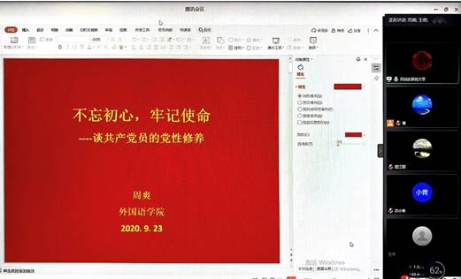 爱爱视频 副院长周爽为大学英语教学部党支部讲授党课 9月23日晚上,爱爱视频 副院长周爽在线上为大学英语教学部党支部讲授题为《“不忘初心、牢记使命”——谈共产党员的党性修养》的党课。