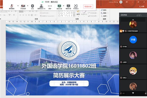 为提高我院学生简历制作的水平,提早培养学生制作简历的意识和能力,我院于7月16日至18日在2018级55名本科生中策划了一场简历制作大赛。党委副书记高敏、班主任王譞、赵飒飒、王勇、兼职辅导员张暖希以及3位学生评委吴佳丽、贾璠、赵振华担任本次比赛的评委。由于受疫情影响,本次比赛以班级为单位,全程采用腾讯会议平台在线进行。本次简历制作大赛自启动以来,经过了简历收集、简历评改和简历展示三个阶段,收到中英德语简历...