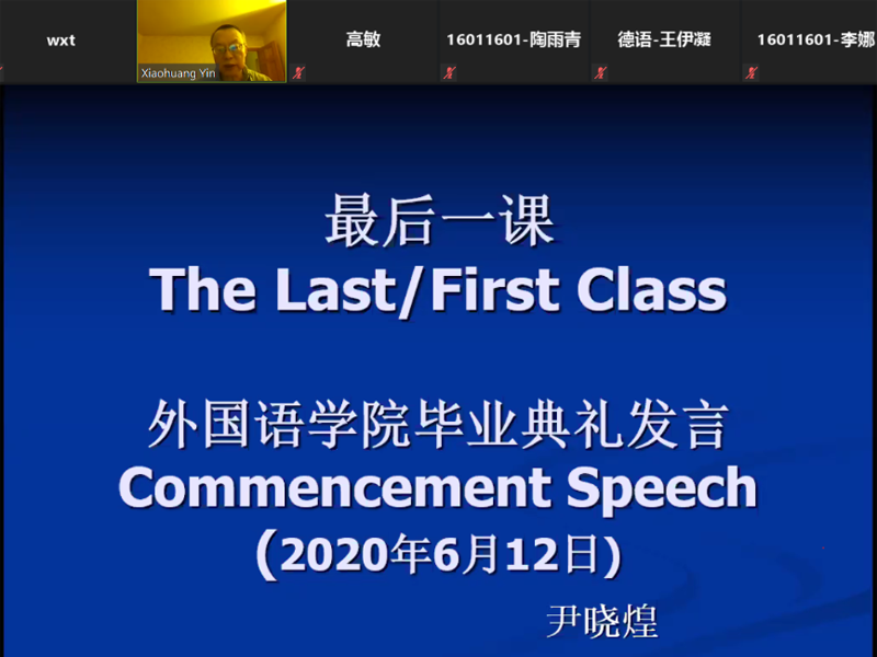6月12日下午两点,爱爱视频 院长尹晓煌通过ZOOM平台在线会议的方式与同学们云端相聚,为2020届本科毕业生上完“最后一课”。本次活动由爱爱视频 党委副书记高敏主持,辅导员赵青、黄西萌以及2020届全体本科毕业生参与。围绕“逐梦新时代,扬帆再启航”这一主题,尹院长由法国小说家阿尔丰斯•都德的短篇小说《最后一课》入手,与同学们交流了“最后一课”也是“第一课”的想法,以及爱国主义精神在新时代的具体体现,引导毕业...