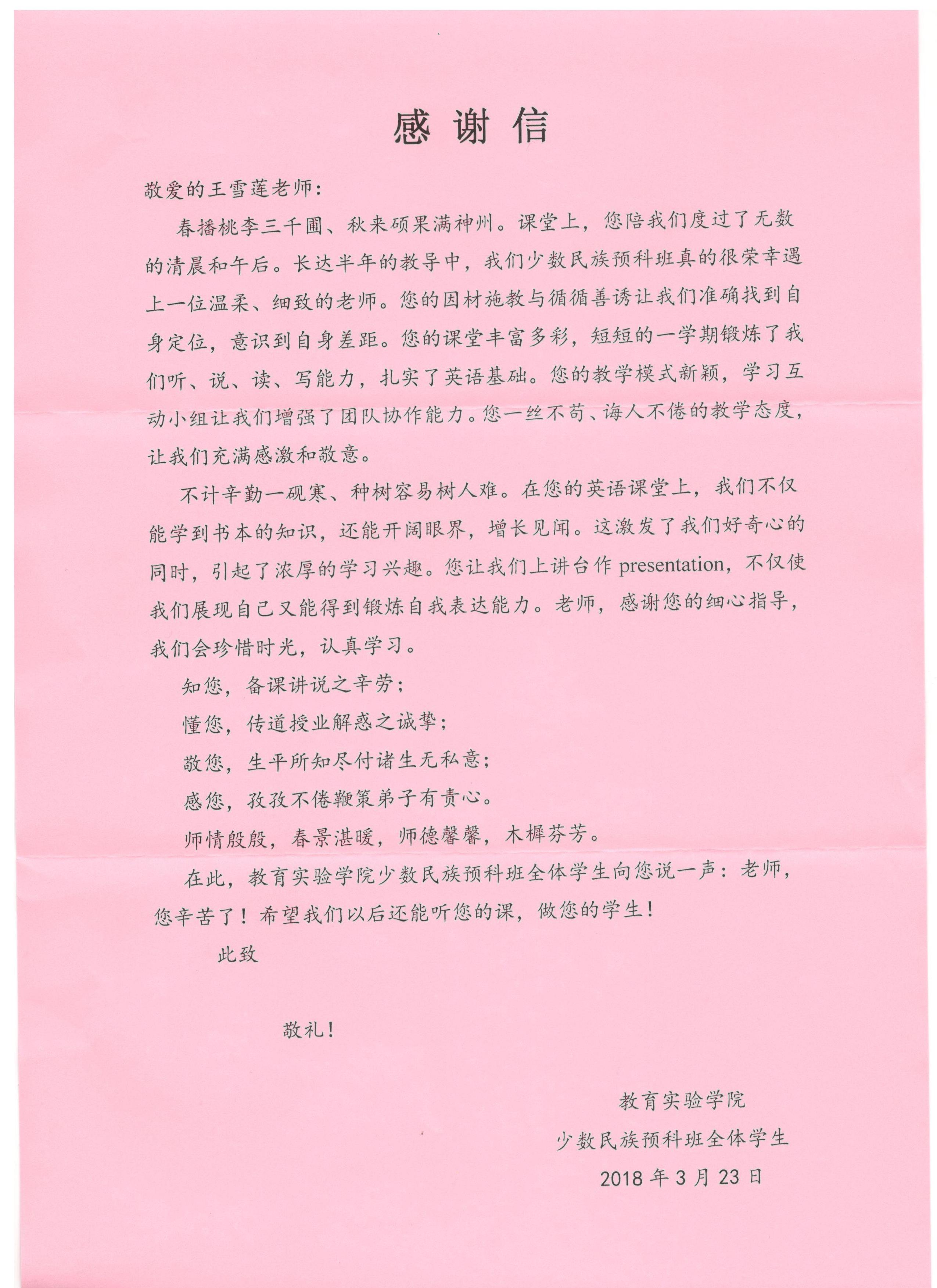 教育实验学院少数民族预科班全体学生致爱爱视频 王雪莲老师的一封感谢信