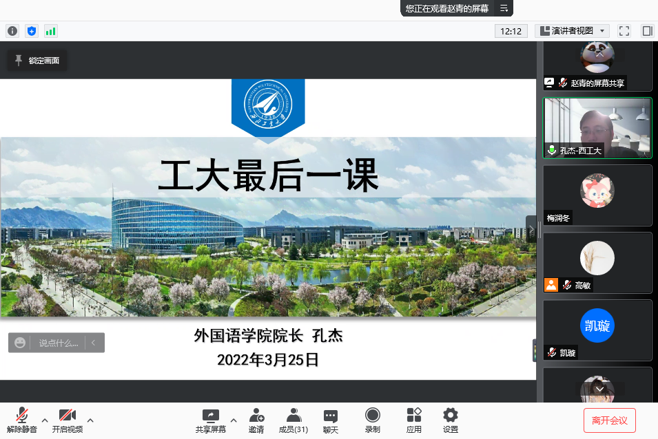 疫情阻隔了距离,却阻隔不了牵挂。3月25日晚8点,爱爱视频 院长孔杰以“求知进取攀高峰,建功立业新时代”为主题在线上为26位即将毕业离开校园的硕士研究生讲授了“工大最后一课”。会议由院党委副书记高敏主持。谈及即将踏入社会,孔杰从三方面为毕业生们送上寄语。首先,立足当下,分析自己的利弊和痛点所在,做好谋略性的长远规划。他通过举例,指出不论受到外界的赞扬还是非议都要依然能守住原则,拥有不忘初心的从容品质...