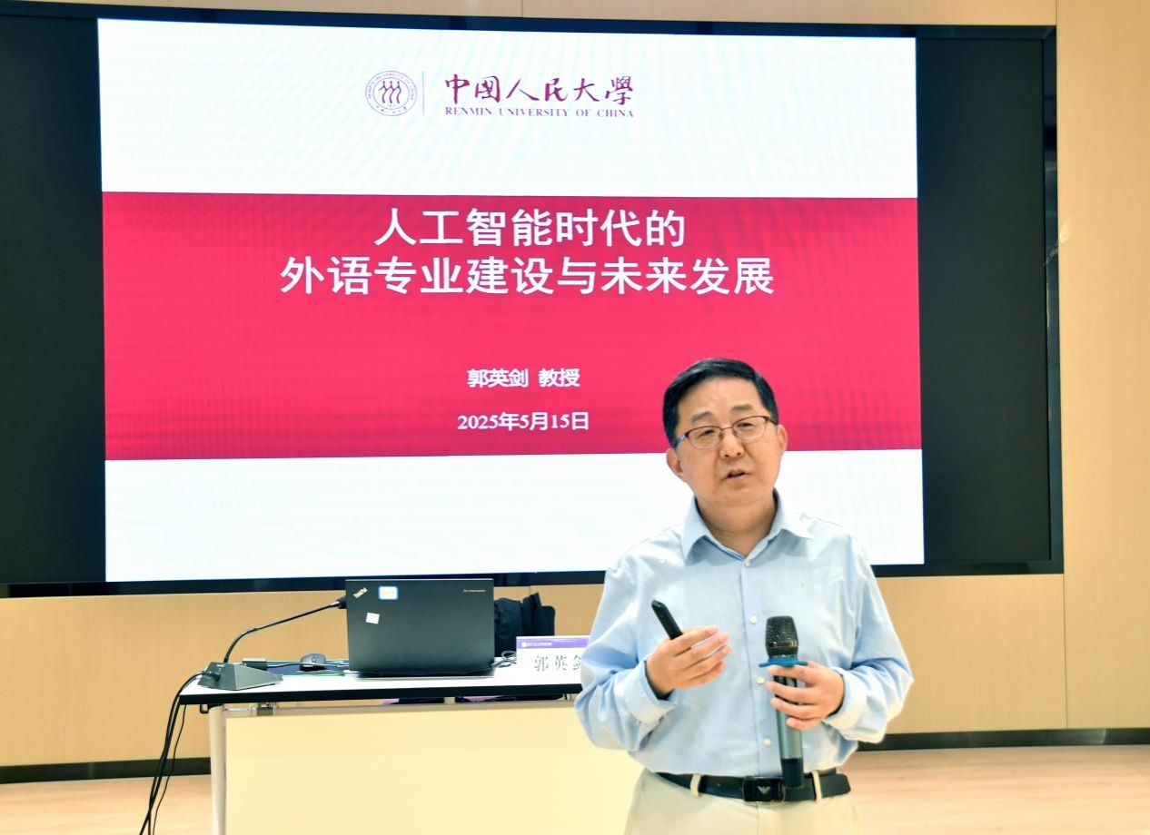 5月15日下午,中国人民大学郭英剑教授在学院楼2楼报告厅作了一场题为“人工智能时代的外语专业建设与未来发展”的专题讲座,院长孙瑜、党委书记王高祖及60余名师生到场聆听。