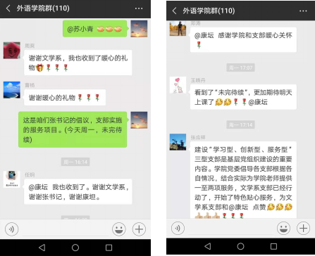 从10月15日至18日,我们利用上午课间和中午午休时间,对我院在教东和教西有教学任务的教师所在教室进行了“暖心茶点”投递。由于很多老师非常爱岗敬业,早早就抵达教室做课前准备工作,亲手收到“暖心茶点”后都很意外和感动。很多当时没有碰面的老师后来也通过社交媒体发出了反馈。从10月15日周一中午开始,各位老师分别通过学院微信群和私信的方式对本次活动积极表达了肯定,感谢了学院党委对广大教师的关怀和对支部服务项目的倡议与指导,也对文学系支部的具体工作实施进行了集体点赞和热情鼓励。