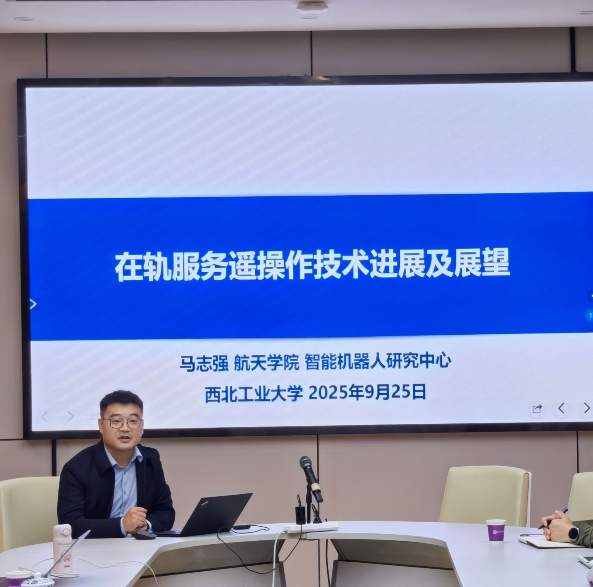 随后,马志强教授以“在轨服务遥操作技术进展及展望”为题,从大国重器入手,引导师生了解了我国在轨服务技术的战略定位和发展背景,通过动画演示与数据,直观呈现了遥操作技术在针对复杂、动态场景帮助人类实现感知和行为向远端的精准延伸和高效交互,清晰展现了我国在轨服务遥操作技术“从无到有、从有到优”的跨越式发展历程。讲座中,他还结合国内外前沿案例介绍了遥操作技术的研究现状、研究进展及未来展望。