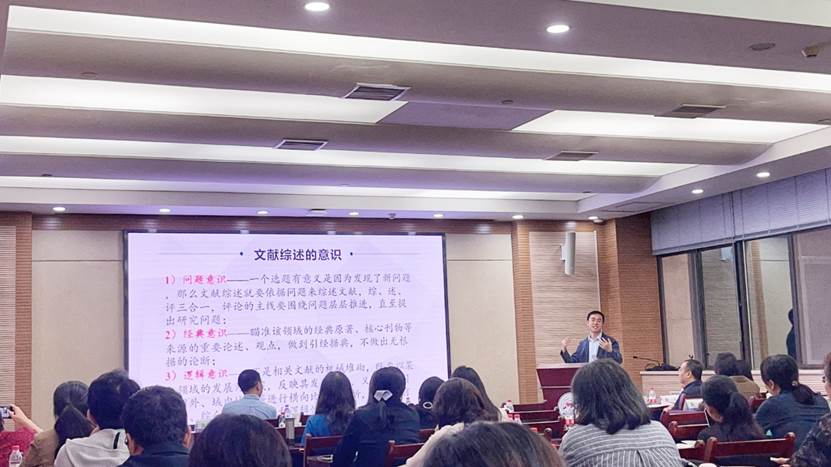 院长任育新教授作了“学术口语话语研究新进展”的学术报告,《外语教学》(C刊)期刊和《西安外国语大学学报》(C扩)编辑部吕生禄副主任作了“外语学科学术论文撰写与发表”的专家报告。两位专家高屋建瓴,向与会的70余位青年教师分享了一场小同行“学术盛宴”,同时又干货满满,详细讲解了外语类高水平期刊对紧扣时代脉搏选题的期许和要求,向与会者展示了“高质量发展”、“命运共同体”、“话语体系”、“国家语言能力”、“中国叙事”、“国际传播能力”等金字金句,引起了与会老师们强烈共鸣,会场互动热烈,收获颇丰,对青年教师找到并从事有价值、有意义的稳定科研方向,通过坚实的学术成果积累和活跃的学术交流,形成个人“学术标签”具有重要的参考价值。