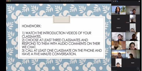 接到线上教学通知时,McEwan夫妇在美国度假,面对资源有限、时差问题、教学软件学习等各种困难,研究生公外教研室主任张放对两位外教进行一对一的帮助指导并测试了多种网络教学平台,最终确定使用Zoom 软件作为直播平台,同时建立了两个班级的微信群, McEwan夫妇成功克服了时差、地域、网络等条件限制,熟练运用多种平台的语音、视频等功能开展网络教学,认真点评学生提交的网络作业。甚至考虑到同学们在疫情期间都宅在家,McEwan夫妇还把一些视频场景搬到室外,让同学们感受南佛罗里达清新的空气,广阔的大海,体验异国风情,寓教于乐一扫疫情的阴霾,受到同学们的一致好评。