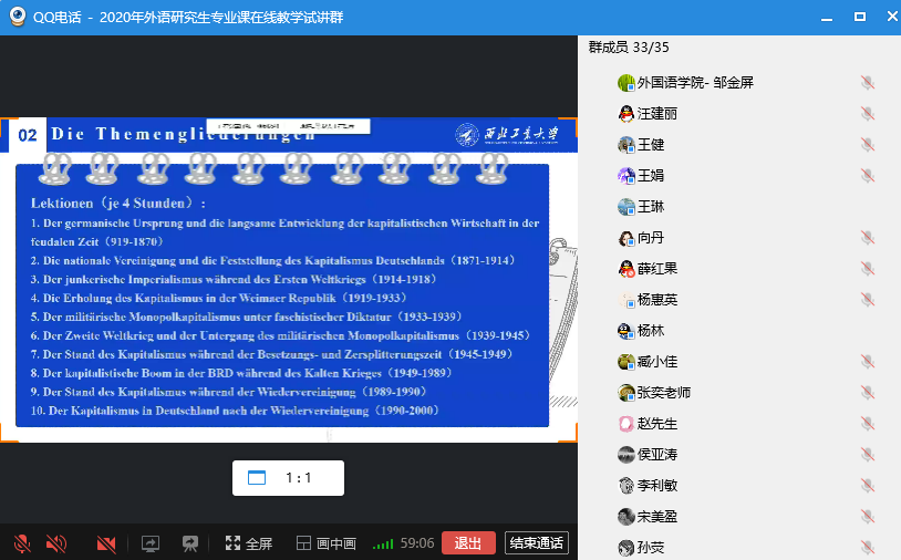 研究生专业课教师覆盖了全院的三个系部,同时,也有双肩挑干部和外籍教师开课。学院下发了专业课试讲的通知后,各系部研究生专业课教师积极参与。参加试讲的18位教师从在线教学前期准备、授课内容、教学设计、教学方法、教学互动及教学考核等几个方面汇报。教师准备充分,参与度高,内容精彩纷呈,最终试讲结束时间比预期长1.5个小时。因语种和研究方向的差异,平时课程交流的机会较少,试讲也为各系部教师提供了一个交流学习的平台。学院10多位教师慕名前来观摩试讲,了解在线教学技术和方法,为后期开课积累经验。