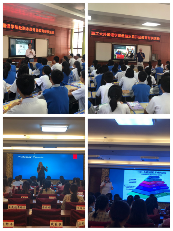 7位中外老师先后抵达融水县民族中学及融水县高级中学,参与课堂教学活动。3位外籍教师的到访,打破了校园以往的宁静。同学们纷纷上前把3位外教团团围住,用惊奇的目光打量着来自远方的客人。胆大的同学甚至用简单的英语跟陌生的客人打招呼、送问候。外教们也用西方特有的方式,热情地回应着学生。课堂伊始,张应祥首先介绍了此次帮扶活动的目的和意义;随后,在两名大英教师的协助下,Christine Tanner 教授与McEwan 夫妇进行了合作教学,分别为百余名初中和高中学生及任课教师展示了长达一个半小时的示范课。在课堂上,Christine Tanner 教授,McEwan 夫妇从教唱英文歌曲入手,激发同学们对英语学习的兴趣,再深入浅出地介绍了西方文化,如西方的重要节日、学生领导力的培养、美国大学的申请流程等,并开展了丰富多样的室外活动。外教们精湛的教学经验、纯正的发音、风趣幽默的肢体语言赢得了在座师生们的阵阵掌声,更是深深地吸引了每一个学生。此外,三位外籍教师还与融水县50余位参加国培班的中学优秀英语教师就教学方法、如何提高学生学习兴趣及如何针对学生学习特点开展个性化教学等方面进行了深入的交流探讨。此次教育帮扶活动虽时间短暂,但所获当地师生的积极反响空前热烈,对当地英语老师教学方法革新及课堂教学改革起到了积极的促进作用,学生们的英语学习兴趣得到了极大的激发与鼓励,外教与学生之间也建立了深厚的友情。Christine Tanner 教授激动地说,明年还会带上自己的家人再来融水,看望可爱的孩子们。
