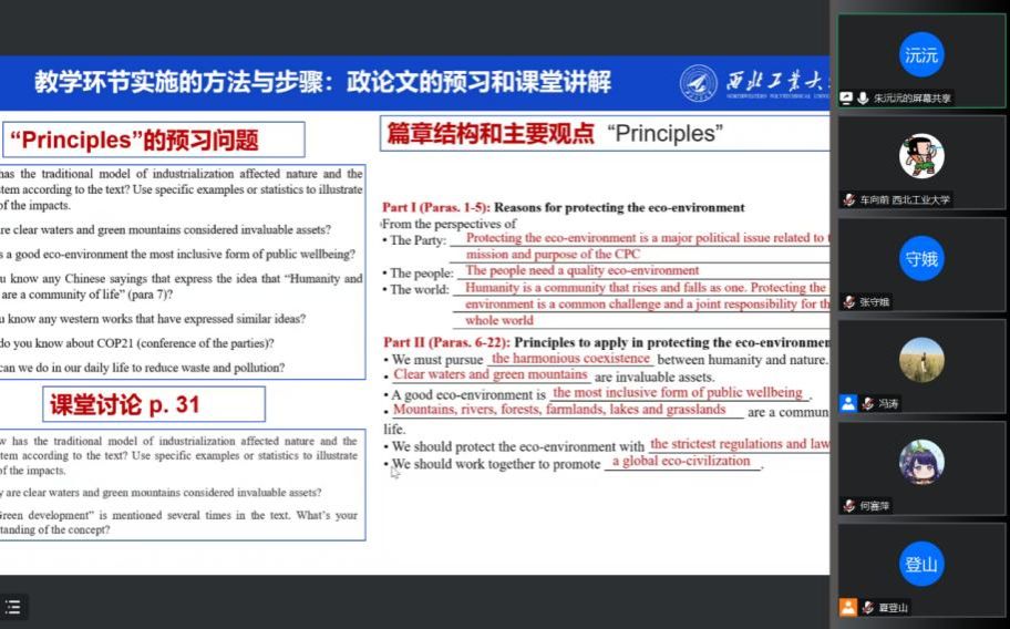 朱沅沅首先就“理解当代中国”教材在我院各个专业的使用情况做了简要介绍,接着以《英语读写教程》第二单元为例,展示了与原教材在英语专业“阅读与思辨”课程中的融合情况。朱沅沅详细阐述了教学环节设计的依据、选择补充读物与设计小组活动的思路、教学环节实施的方法与步骤等,突出了政论文统领、反思性学习等教学特点。