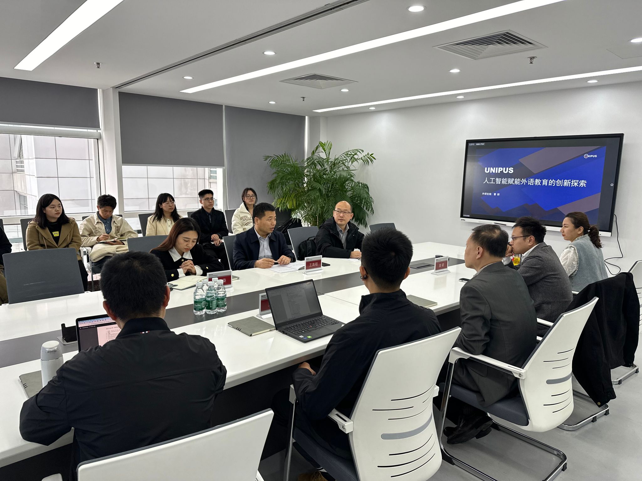 11日下午,王高祖一行参访了位于北京中关村的北京外研在线数字科技有限公司(以下简称“外研在线”),并与外研在线的市场经理刘心、外研社高等营销中心西北营销大区高级市场经理袁硕、产品总监王锐、方案总监曹群、研发总监刘博岩进行了座谈交流。