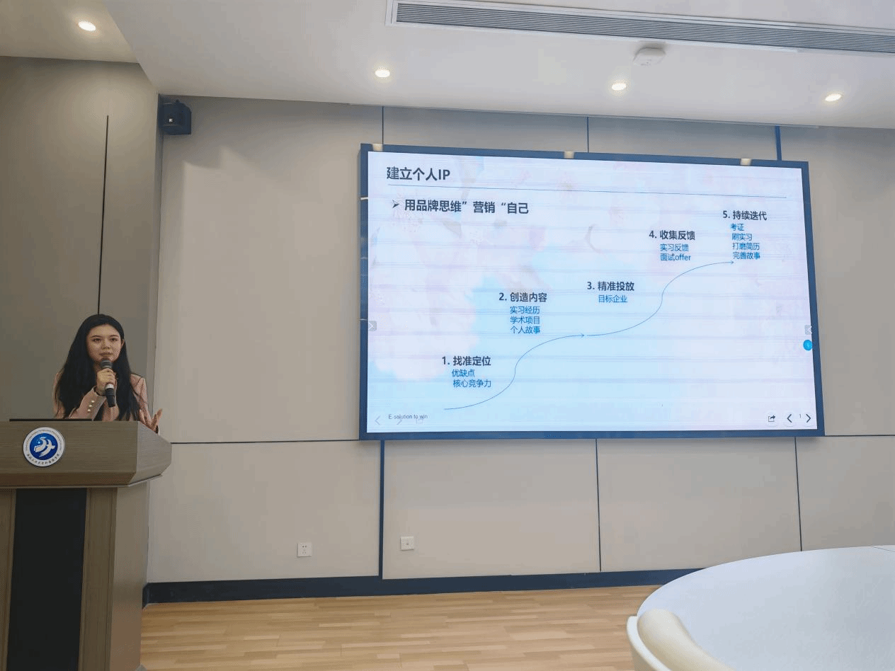 在简短的自我介绍之后,杨心玮首先指出外语学生在表达、写作、视野等方面具有优势,要学会接纳自己;接着,她通过分析如何进行行业选择、企业选择、岗位选择,嘱托同学们要学会顺势而为,选择适合自己的,勇敢试错。最后她从读书有用、开拓视野、建立个人IP三方面详细分享了同学们如何做好职前准备。在交流环节,她耐心回答了同学们的问题,帮助大家明确了自己的未来职业方向。她表示同学们应积极打开视野、放宽选择,在实践中不断增强自身能力。