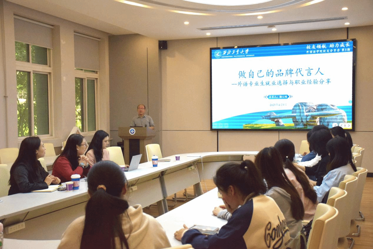 在学院楼204举办了“校友领航”第3期:做自己的品牌代言人——外语专业生就业选择与职业经验分享活动。本期邀请我院2019届英语语言文学专业硕士校友、西安市第十七届人大代表杨心玮进行分享。院长孙瑜、院党委副书记张桑桑及二十余名本硕学生参加了交流。分享会由研究生辅导员赵青主持。