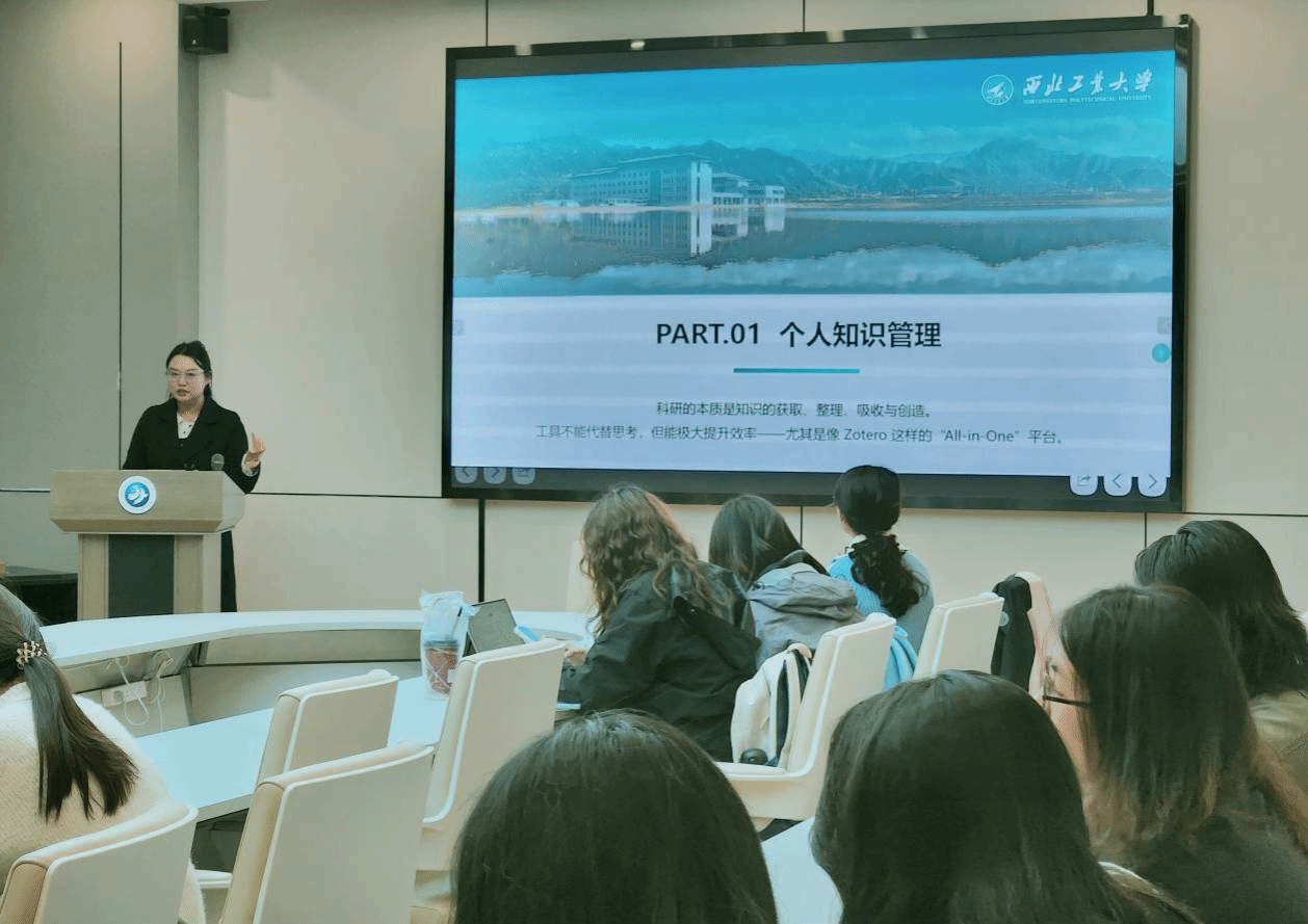 2024级硕士研究生王静娴则聚焦文献管理痛点,带来Zotero工具的实操教学。她通过现场演示,完整呈现文献收集、分类标签设置、阅读笔记批注的操作流程,重点讲解如何利用软件插件实现论文引文自动插入与格式同步调整,帮助同学们掌握高效文献管理方法,减少科研时间内耗。