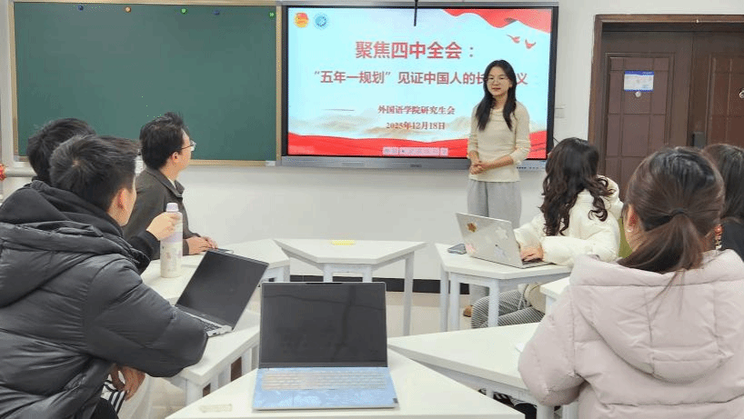 活动伊始,院研会执行主席李晨菲围绕“五年规划:见证中国的长期主义”这一主题,为大家系统梳理了二十届四中全会审议通过《中共中央关于制定国民经济和社会发展第十五个五年规划的建议》的重大意义,并结合外语学科特点,引导同学们思考中国式现代化进程中青年一代的使命担当。